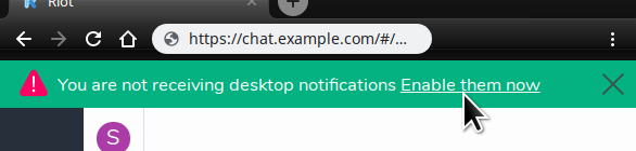 Upon your initial sign in, you may be prompted to enable desktop notifications when you receive chat messages. We recommend that you allow desktop notifications from the Chat server. You can later configure which rooms or users cause notifications.