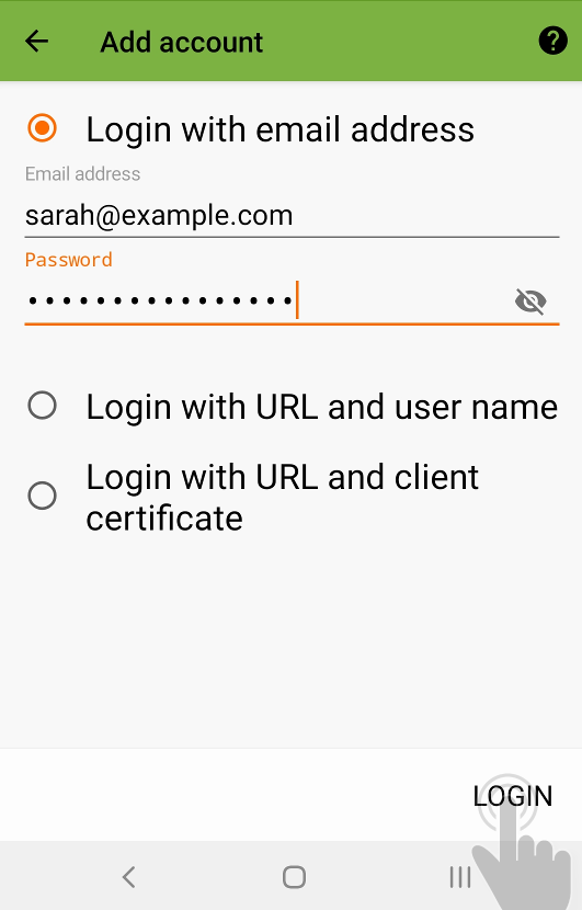 Tap LOGIN. DAVx⁵ will query the base URL from your email address for both CalDAV and CardDAV, and use whatever it finds.