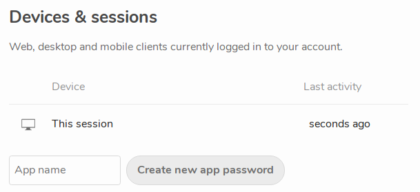 This section displays a list of currently and recently connected devices and browser sessions, and allows you to disconnect any that you don’t recognize or aren’t using any more. But we’re more interested in the Create new app password controls at the bottom for now.