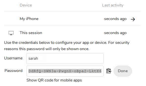 You create and manage your own app passwords on the Cloud server using a web browser. Ideally, you’ll generate individual app passwords for every device you connect to your account. This allows you to disconnect a single device (e.g. mobile phone, tablet, or laptop) if it is lost or stolen, without having to disconnect and reconfigure your other devices.