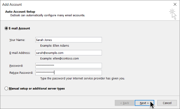 If automatic configuration fails for some reason, you can choose Manual setup or additional server types in step 3 and then use the Manual Setup instructions.