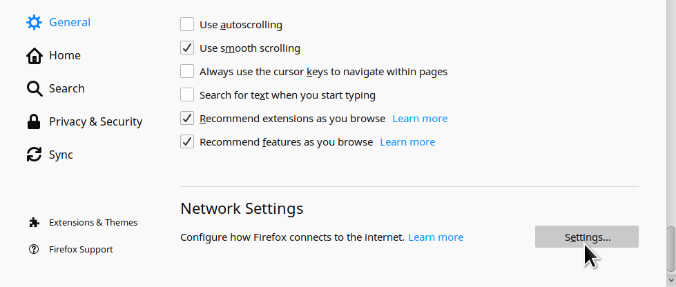 In the General section, scroll down to Network Settings and click the Settings… button.