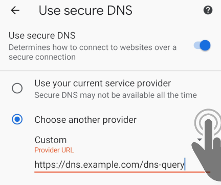 Select Choose another provider and enter the following URL: https://dns.efficientdocuments.com/dns-query.